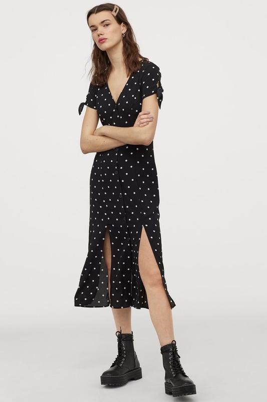 Сукня довжини міді з віскозного крепу з V-подібним вирізом. * Короткі рукави з невеликим вирізом і зав'язками по краю, ґудзиками спереду і двома розрізами по краю. * Без підкладки. В ідеальному стані, без дефектів. Розмір по бірці 38/10 Напівобʼєм грудей 45 Напівобʼєм талії 39 Довжина 124 Довжина рукава 15