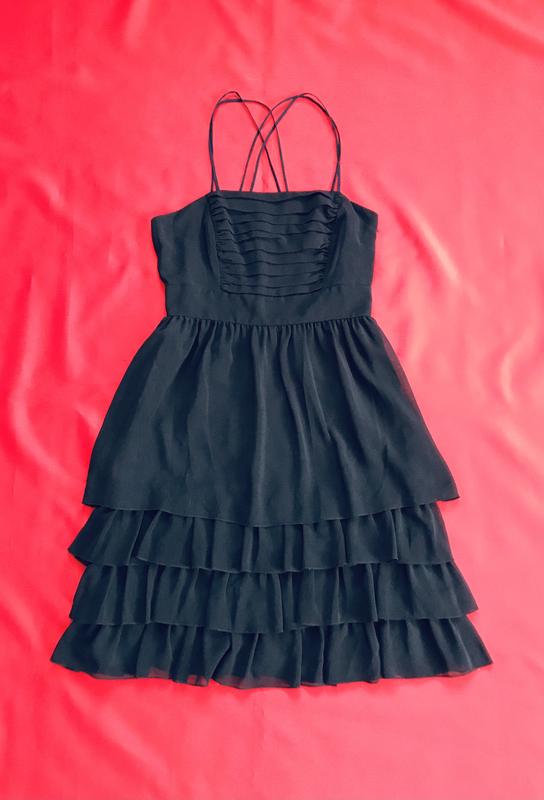 Платье с рюшами на бретелях бренда Montego в хорошем состоянии. Цвет темно-синий (более до черного), бирка с составом ткани отсутствует (на ощупь в качестве шифона, подкладка полиэстер). Сбоку молния.