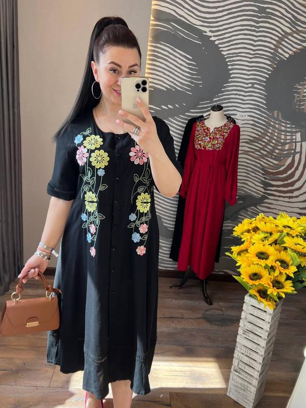 розкішна сукня преміум класу з першої хвилини притягує до себе увагу своєю простотою і елегантністю одночасно, це вбрання для роботи і свят сукня прямого крою з круглим вирізом, короткими рукавами і кишенями з боків спереду застібається на невеликі ґудзики, головною перевагою його є різнокольорова вишивка спереду, сукня дуже красиво виглядає і відмінно сідає на дівчат з фігурами різного типу розміри 50, 52, 54, 56, 58 в залежності від розміру довжина 112-116 см, об'єм грудей по виробу 104, 108, 112, 116, 120 см , довжина рукава від шиї 44-48 см код L8892-3