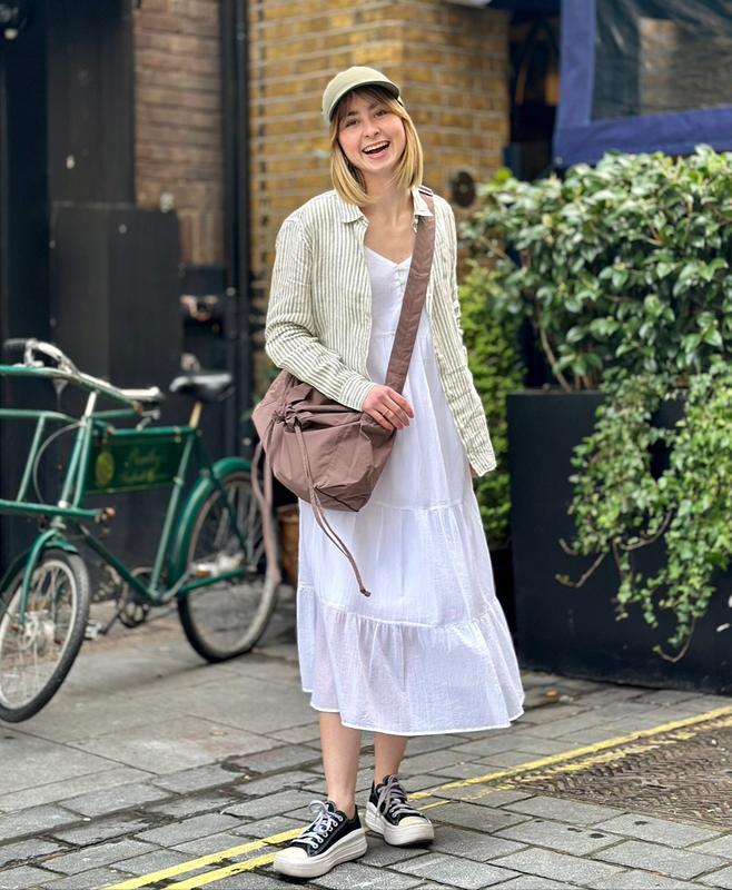 Широкий А-силует. Мягкая и легкая ткань из 100% хлопка. - 100% гофрированная хлопковая внешняя ткань. - Объемная многоярусная длина миди А-силуэта. - С V-образным вырезом и регулируемыми лямками. Изображение продуктов могут содержать недоступные цвета. материал: [00 WHITE] Внешняя ткань: 100% хлопок / подкладка: 100% полиэстер