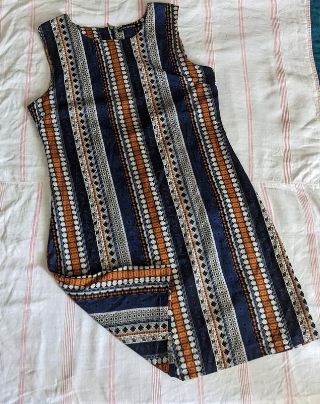 платье хорошего качества бренд adagatti Испания Мадрид сделано в Индии 100% полиэстер с интересным орнаментом в груди от и дО подмышки спокойном состоянии 47 см тягну до 51 талия примерно серединка 44-46 бедра нашла саму максимальную точку 53 тянется до 56 ширина самого низа 55 см по стану очень красиво если прямо рассмотреть присутствуют легкое окисление и щепотки облезная кроска на молнии молния на спине достаточно длинная если расстегнуть то целых 50 см удобно надевать в целом платье очень приличное