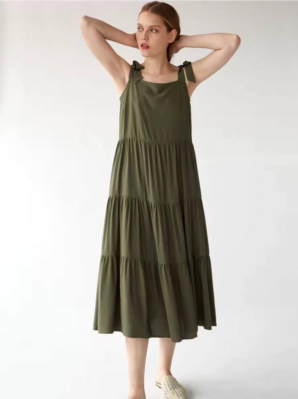 Ярусное летнее платье цвета хаки Легка тканина Бретели можно завязывать на разной высоте Длина по боковому шву 100 см ПОГ 42 см ПО низу 120 см