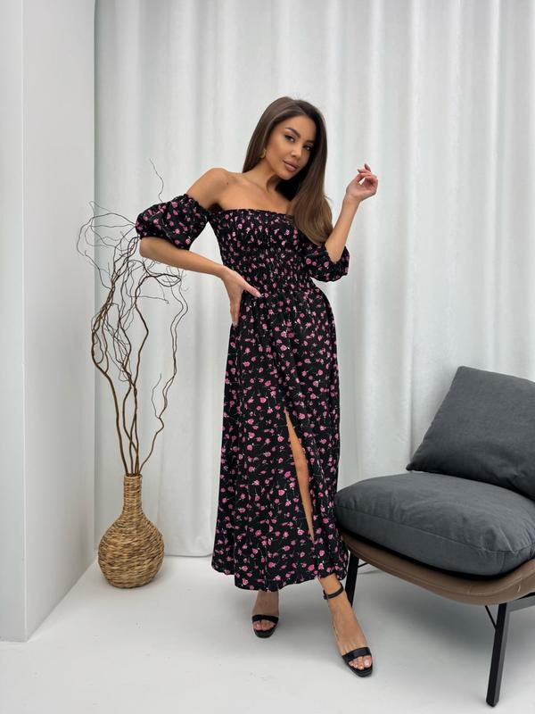 Платье-макси Ткань: евро-софт Цвет: черно-белый, черно-розовый Размеры: S, M, L, XL Описание: Платье-макси с жаткой на груди, открытыми плечами и рукавами-фонариками. Изделие приталенного кроя с расклешенной длинной юбкой, декорированной двумя разрезами-! Цена: 620 грн