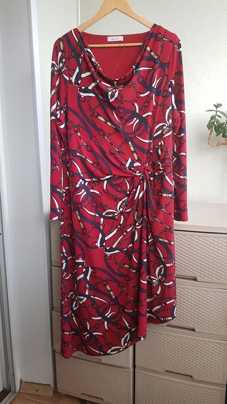 Трикотажное платье миди с асимметричным низом. Цвет насыщенный красно-бордовый. Красиво тянется. Гладкий трикотаж. Имеет подкладку (теж трикотажную). В новом состоянии, без бумажной бирки, но с пластиковым колечком от бирки. Витринный товар, есть несколько милых затяжек на подкладке.