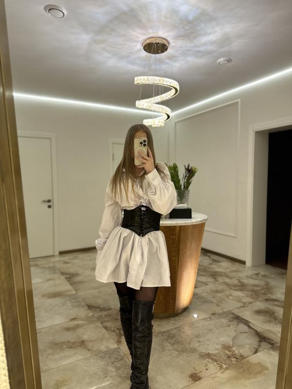 Сукня білого кольору розмір S, можна на М. На фото сукня вдягнута на ХС і зверху сукні вдягнут корсет. Віддам комплектом. Стан ідеальний, вдягнута раз. Сама сукня також затягується спереду але я поверх цієї шнуровки вдягаю корсет і так виглядає більш ефектно. Спинка відкрита але вдягала з ліфчиком і все супер