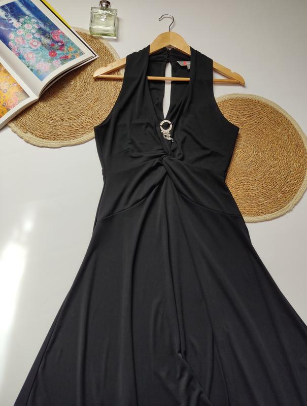 Приталенное вечернее платье с украшением на груди. Плотный полиэстер. 🔹Длина от плеча по боковому шву 98, самый длинный отрезок 121 🔸Длина от плеча до шва под грудью 35 🔹Груди 44 🔸Талия 36 🔹Стегна 57