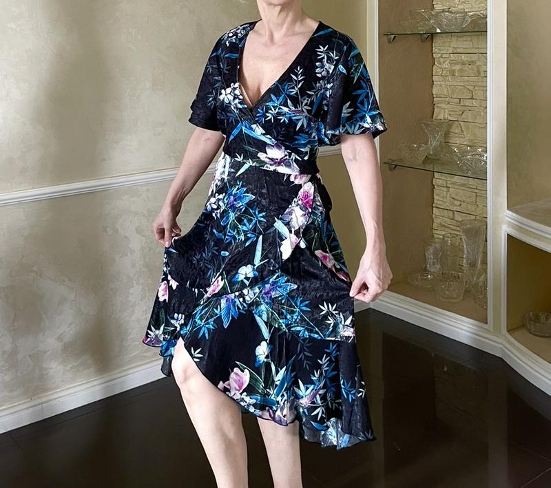 Lipsy London нова чудова сукня-халат на запах. Дууже красива теснена тканина. Розмір 10/38. Довжина 89/116 см. Напівобхват грудей від 37 см (на запах). Поліестер/еластан.