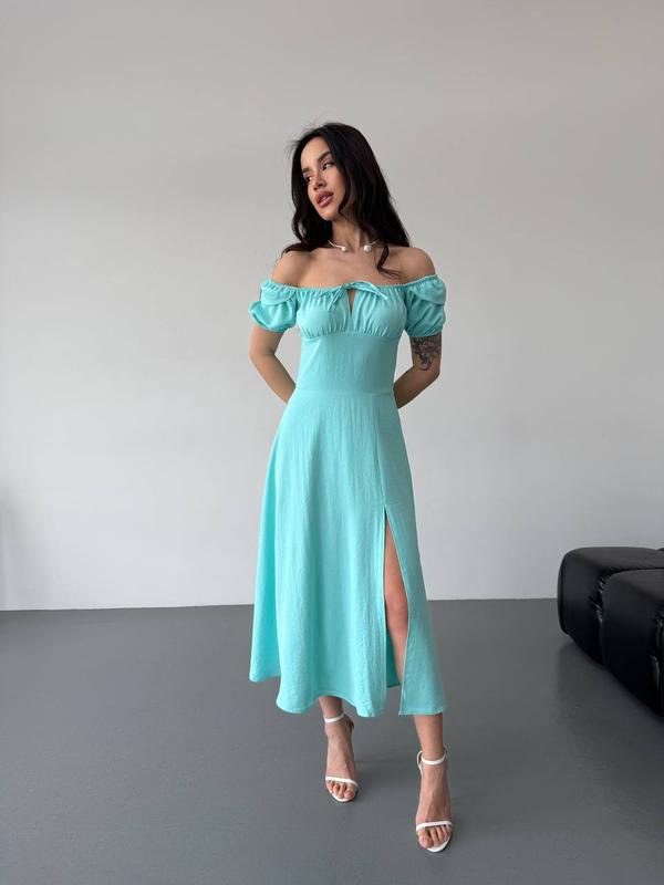 Летнее платье миди с разрезом и открытыми плечами sb-470