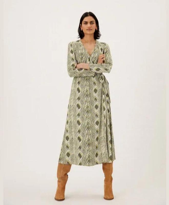 Платье миди в змеиный принт из 100% вискозы от Marks & Specer. V-образный вырез, зафиксированный запах и длинные рукава. Отрезанная эластичная талия с регулирующим поясом сбоку. Размер 14/42 Состав : 100% вискоза Длина - 121 ПОГ - 50 ПОТ - 42+ ПОС - 63 Плечи - 39 Рукав - 62