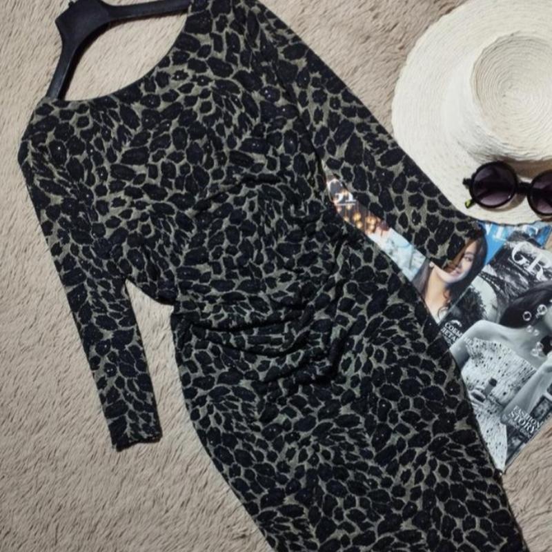 В ідеальному стані. сукня міді по фігурі з драпіруванням та блискітками. Тканина середньої щільності, є підкладка, тягнеться. Розмір 14/42/XL, але дивіться по замірам Заміри(напівобхват): Груди 45(тягнеться до 55) Талія 37(тягнеться до 48) Стегна 49(тягнеться до 62) Рукав 44 Довжина від плеча 100