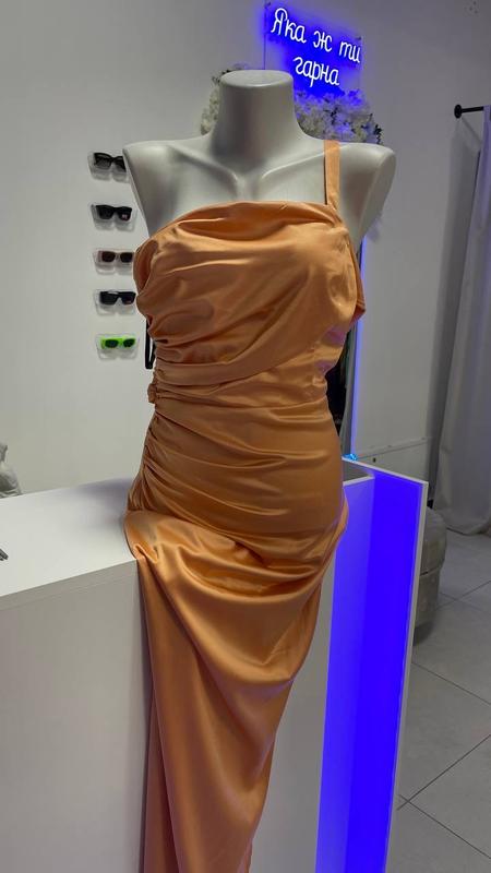 Атласна сукня персикового кольору від Missguided — вишукана й ефектна модель для особливих подій. Виконана з блискучої атласної тканини, вона красиво струмує по фігурі, надаючи образу ніжності та розкоші. Довжина міді додає елегантності, а розріз на ніжці підкреслює жіночність і додає звабливого акценту. Одна сторона сукні оформлена делікатними збірками на талії, які вигідно моделюють силует. Красивий корсет формує і підтримує верх, акцентуючи увагу на фігурі, а одна лямка через плече надає сукні сучасного та стильного вигляду.