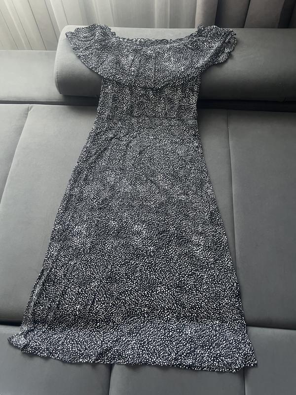Ідеальна літня натуральна сукня в білу цяточку ❤️ По бокам невеликі розрізи.Гарно тягнеться у верхній частині- в грудях та талії. Розмір 12 ПОГ-40-54 ПОТ-35-48 Довжина-108 Розрізи-21