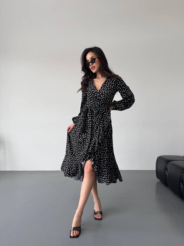 Женское платье-миди на запах с рюшами и длинными рукавами в горох