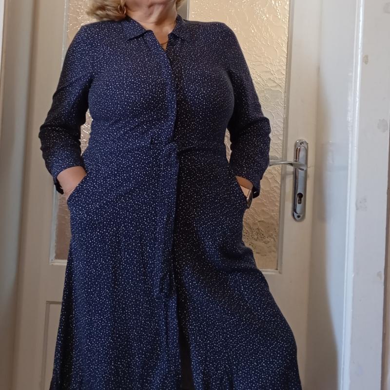 Платье-рубашка синяя в орех с 100% вискозы на потайных пуговицах, с двумя карманами, размер 50-52, замеры: ПОГ-52, талия-48 (тянется на кулиске), бедра -62, длина -115, рука три четверти -52, плечи-40. Есть пояс.Стан идеален.