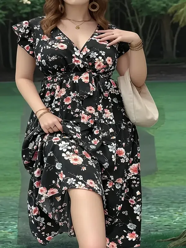 4XL 119-125 104-110 129-135 Элегантное платье миди с цветочным принтом для полных женщин – глубокий V-образный вырез, рукава с рюшами и поясом – машинная стирка, полиэстер, черно-красные розовые цветы