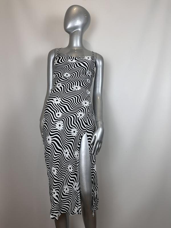 Стильное женское платье миди от Bershka, размер XS. Черно-белая абстрактная волнистая графика с цветочными элементами, тонкие перекрестные бретели, элегантный вырез на ноге. Изготовлена из 100% вискозы - легкая и приятная к телу. Идеальный выбор для вечеринок, выходных или летних прогулок. Произведено в Турции. Замеры: 📌Длина без бретели - 110 см, разрез - 44 см 📌ПОГ- 43 см 📌ПОТ - 28 до 32 см 📌ПОБ - до 45 см НП