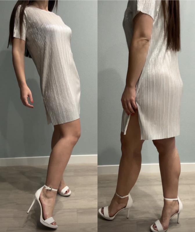 Next нова дуууже красива сукня прямого крою, можно під пасок. По боках розпоріхи. Красива тканина з блиском-металік, фото не передає. Розмір 8. Фото на моделі з розміром S. Довжина 87 см. Напівобхват грудей 48 тягнеться до 65 см.