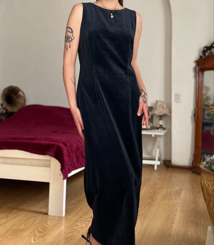 Вінтажна мінімалістична, але елегантна оксамитова сукня від Josephine &Co у темно-синьому кольорі Силует прямий, особливість цієї речі це спинка, оскільки сукня застібається на безліч ґудзиків. Єдине, що одного з них не вистачає (третій зверху). Місцями присутні непомітні потертості. Через це ціна буде нижчою. Але тканина чудова якісна бавовна, справжній скарб. Розмір М Загальна довжина - 135 см Напівобхват груди - 48 см Напівобхват талія - 43 см Напівобхват стегна - 49 см