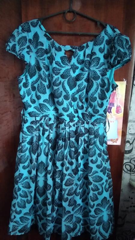 Синего цвета платья в черные цветы с плиссированной юбкой.Короткие рукава-фонарики, придающие кокетливости.Помышкам 50см,но есть декольте, за счет счет которого объем может немного увеличиться.С стороны застегивается на молнию.В поясе 42см,ное тянет.Е бретели. для пояска (в комплекте не шел) Сзади на шее завязывается на бантик. Дов.99,5см и 3см добавил крупиво, которое выденется из подюбника. Р.48-50 Ответим на дополнительные вопросы. См. Более полное объявления.