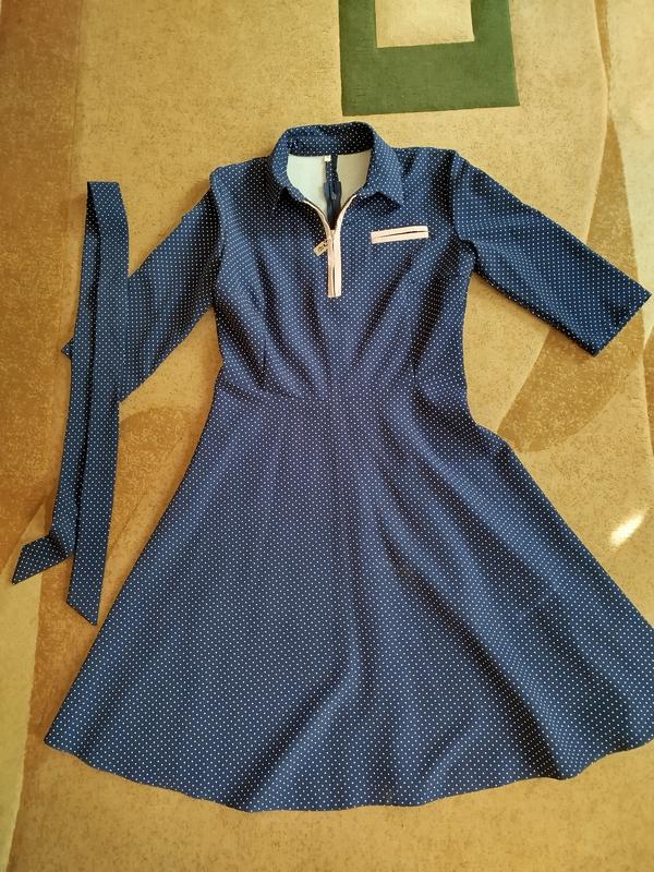 Великолепное платье в горошек, юбка слегка клеш, застегивается спереди на молнию и по спине также есть молния, подходит на все случаи жизни-и в праздник и на войлок. Рукав 3/4.
