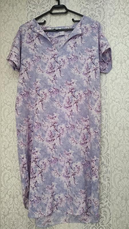 Это женское платье свободного кроя с коротким рукавом, есть поясок. Оно выполнено из легкой ткани светло-сиреневого цвета с нежным цветочным узором в розово-фиолетовых тонах. Платье имеет V-образный вырез с отложным воротником. Длина - примерно до колена или чуть ниже, в зависимости от роста. Общий стиль – повседневный, с нотками романтичности и комфорта. Без дефектов, состояние-новой, брала в интернете не подорвалась длина