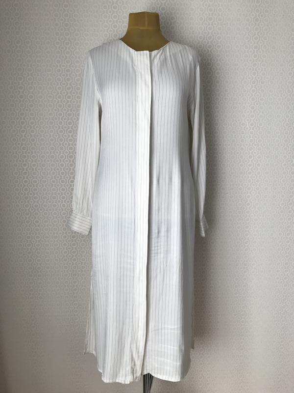 Новое с этикеткой! Белое платье рубашка из вискозы от MNG (Mango), размер M. Состав: 99% - вискоза, 1% - полиэстер. Тонкая пунктирная полоска черного цвета на основном фоне ткани (фото 5). Кругло овальная горловина. Длинный слегка приспущенный рукав. По краю рукава идёт манжет с двумя пуговицами чёрного цвета. Застёгивается на пуговицы, спрятанные под вертикальной планкой (фото 1). Можно носить как в свободном стиле (фото 1), так и с пояском (фото 2), который в комплект не входит. По боковому шву снизу идут разрезы с обеих сторон. Без карманов. Нюансы и дефекты отсутствуют. Замеры изделия в не растянутом виде, см: плечи 42, подмышки (примерно равно ПОГ) 49, ПОТ 47, ПОБ (Замер делаю на расстоянии 65 см от плечевого шва, если вещь короче, то по краю изделия) 52, длина 114, длина рукава 58,5. Объёмы манекена, см : плечи 40, ОГ 97, ОТ 77, ОБ 100 Отправляю Новой почтой либо наложенным платежом (при условии оплаты доставки в оба конца), либо по предоплате на карту Приват, Укрпочтой по предоплате, Meest по предоплате Продаю много фирменных вещей Airfield, Strenesse, Gerry Weber, Steilmann, Brax, Bonita, Basler, Frank Walder, Apanage, Olsen, Ulla Popken, Gardeur, Monari, Rabe, Guess, Hauber, Marks&Spencer, Concept K. Много новых вещей (с этикеткой) - можно на подарок. Смотрите другие мои объявления. Спасибо, что заглянули :-)