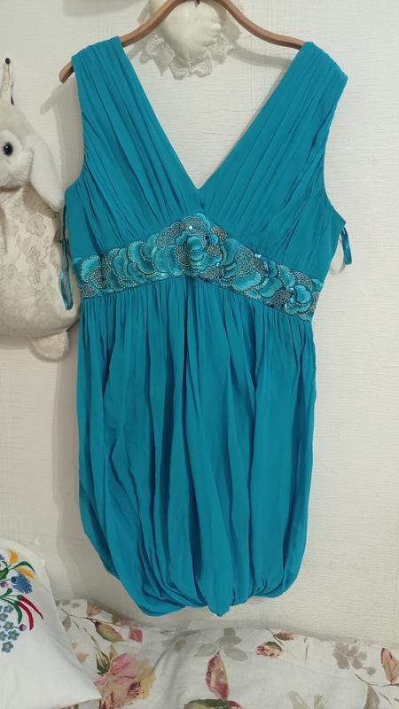 Великолепное шелковое платье, интересный дизайн, шелк как-то необычно задропирован, юбочка-бочонок. Красивый декор, вышивка, украшенная пайетками, красиво блистает и мерцает при искусственном освещении. Платье в прекрасном состоянии, без недостатков, дефектов в загрязнений. Подкладка - полиэстер, но атлас, тоже очень красивая внутренняя сторона, сфотографировала. Размер по набору - 14. L, кажется. Плечи - 42, подмышками - 53, талия - 43, может там, где вышивка это выше талии, такой дизайн, мерью талию где вышивка. Бедра - 58, померила по подкладке, которая, дожди, покроенная по фигуре, с вытачками в виде сукочки. Длина - 96. Невероятный волшебный цвет, снимаю при искусственном освещении, при дневном еще лучше.