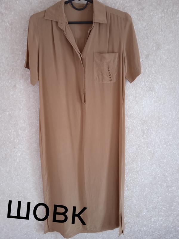 тоненьке літнє плаття прямого вільного крою, шовк 100%, колір ,,карамель,,, розмір орієнтовно s-m, керуйтесь замірами довжина 108 півобєм груди по спинці під рукавами 49 плечі 35 рукав 20 півобєм бедра орієнтовно 50