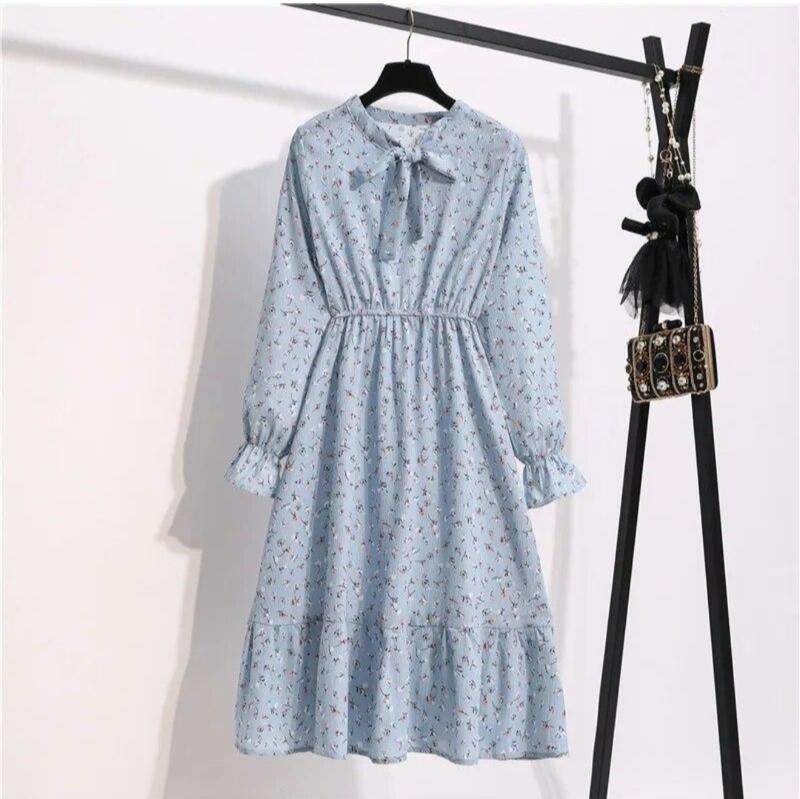 Элегантное женское платье с рюшами и цветочным принтом, весна/осень, приталенное на талии, на шее с бантом. Длина 104см. Синтетический материал