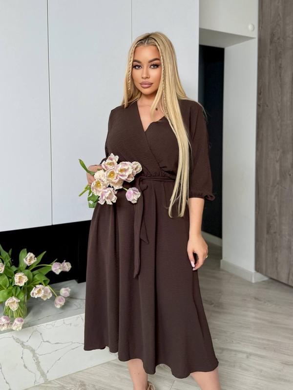 Сукня на запах🎀🎀🎀 Модель 1026 Плетений пояс можна придбати окремо- 100 грн 🚩Тканина: американський креп 🚩Розміри: 50-52, 54-56, 58-60, 62-64 🚩Кольори: чорний, насичений зелений, блакитний, шоколад, троянда Елегантна сукня з американського крепу в ідеально підкреслить вашу жіночність і витонченість. Модель із запахом та рукавами 3/4 створює вишуканий силует, а пояс акцентує талію, додаючи образу легку нотку бохо-стилю. Легка тканина, що струмує, красиво драпірується, забезпечуючи комфорт і стиль одночасно. Доповнюй образ мініатюрною сумочкою та бежевими босоніжки на підборах – ідеальне рішення як для повсякденного носіння, так і для виходу.