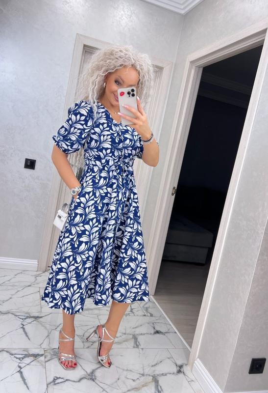 Женское летнее платье синее белое из софта приталенное нище коленей с короткими рукавами р...