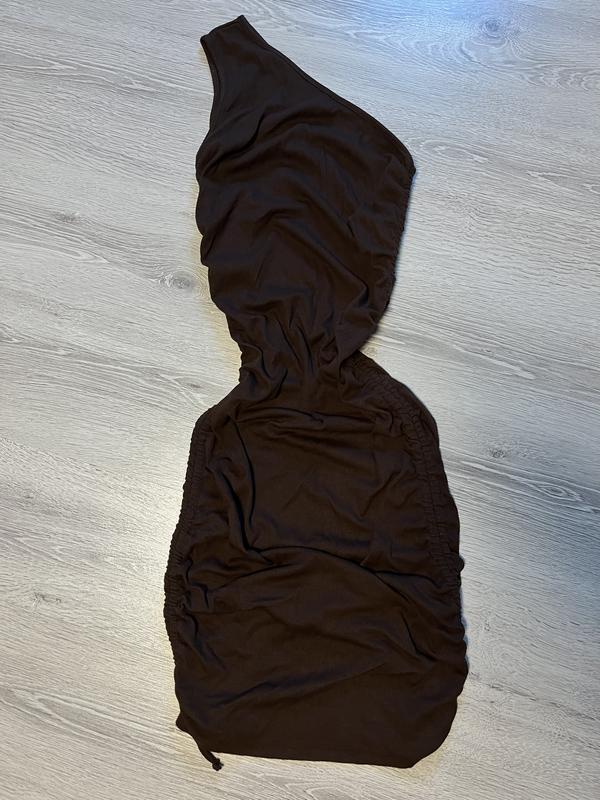 Сукня міді,в рубчик, на одне плече,приталена,розмір м-л,шоколадного кольору,має шнурівки побоках якими можна регулювати довжину