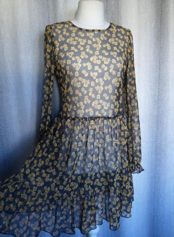 Женское ярусное летнее платье, платье в мелкий желтый цветок, сетка topshop Бренд, состав и цвет на фото, в одном размере 10, наш 44-46 ( маникен М) замеры плечи 37 см, ширина горловины 20 см, плеча 9 см полуобхват груди 45 см, талия 43 см, по шву 46, низ свободно,. Длина от плеча 88 см ( 43+ 30+15), Дллина рукава 62 см+рюш., полуобхват бицепса 15, внизу рукава 8 см. Без застежки без подкладки, светится, тянется. пите о подкладке.