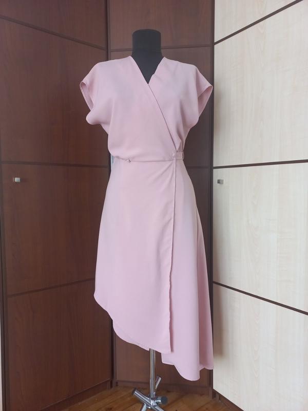 платье на запах пудрового цвета с асимметричным подолом, на левой ноге есть разрез, на спине тоже интересный разрез, фиксируется поясом, пуговицы декоративные. Длина от плеча до талии38 см, длина юбки 53/82 см, высота разреза 42 см, ПОГ 46 см, за счет запаха может быть больше, ПОТ 33 см, тоже можно регулировать поясом, ПОБ 49 см, ширина плеч 54 см.