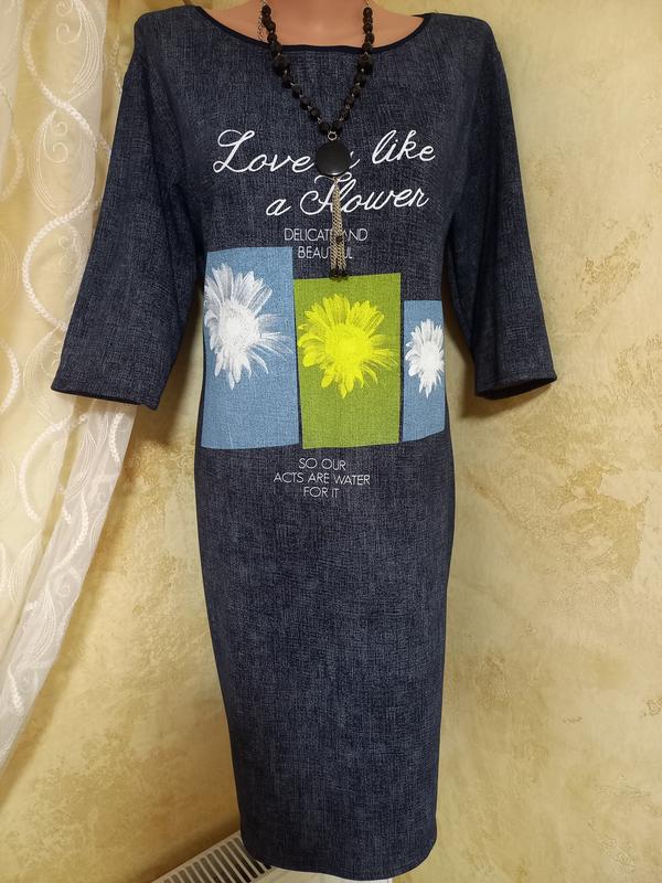 Платье в идеальном состоянии с очень красивым принтом, очень красиво тянется, ткань с имитацией под джинс, очень стильная ❤️🔥 Длина по спинке 90 см. Обхват грудей 100 см. Обхват по талії 92 см. Обхват Бедра 108 см. Обхват по низу 90 см. Длина рукава от плеча 35 см, от горловины 45, идет на Размер л-хл-2хл.