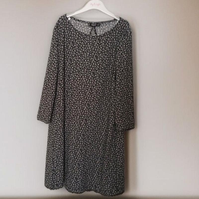 Стильное женское платье черного цвета с мелким белым принтом. Прямой свободный фасон, рукав 3/4. Ткань приятная к телу, не просвечивается. Идеальный вариант на каждый день или для офиса. Состояние очень красивое, без дефектов. Размер: M