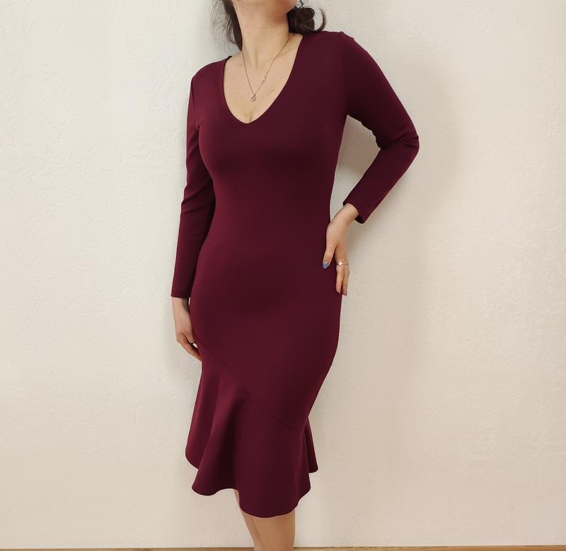Новая вискозная миди-платье от дорогого британского бренда French Connection. Изготовлена она из смесового материала: вискоза, полиамид и эластан. Полотно плотное, достаточно "толсткое", структурированное, красиво держит форму, имеет моделирующий эффект, гладкое и нежное к телу. Платье имеет классический крой: приталенный силуэт, красивый V-образный вырез, длина ниже колена, баска по низу. Для данной вещи подобрали изысканный оттенок бордо. Платье совершенно новое, сохранилось часть бумажной бирки. Очень эффектная вещь, которая однозначно привлечет к вам внимание. Для примера прикрепляю официальный сайт бренда (образное платье будет варить на нем около 100-120 евро) - https:/*************************************************** Размер: на бирке указан размер XS, и лучше ориентироваться на замеры. Замеры: ПОГ - 40 см, ПОТ - 34 см, ПОБ - 45 см, низ - 79 см, длина - 105 см, плечи - 37 см, длина рукава - 54 см, ширина рукава - 29 см. Состав: 73% вискоза, 24% полиамид, 3% эластан. Параметры модели: ОГ - 84 см, ОТ - 68 см, ОБ - 96 см. Рост - 170 см.