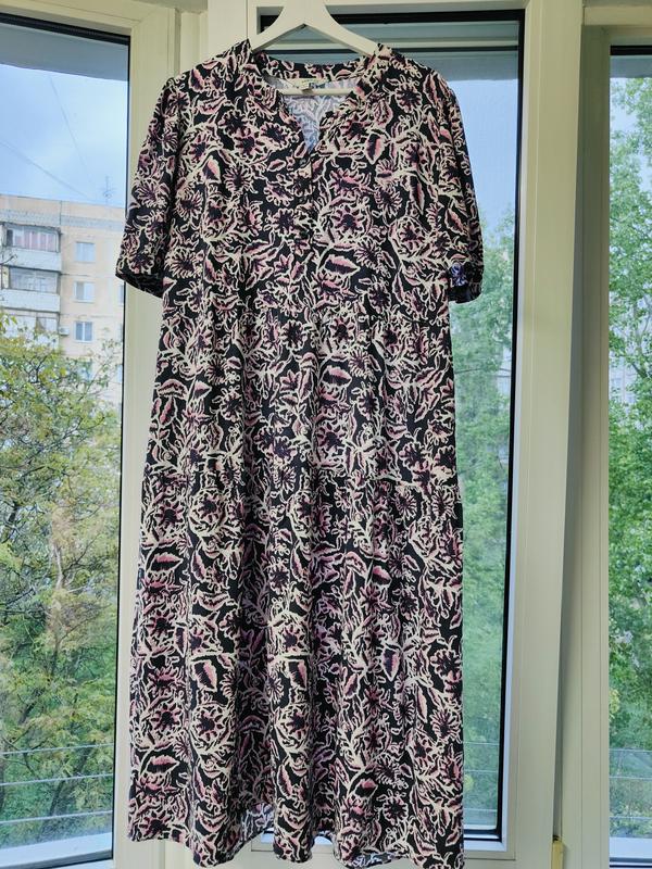 Это воздушное платье привлекает внимание своим ярким принтом по всей поверхности. Оно выполнено в классическом крое для удобства ношения. Лиф имеет аккуратную планку с пятью пуговицами, спускающуюся от привлекательного круглого выреза. Ярусы придают объем юбке миди, а короткие рукава собраны в аккуратные манжеты. Коллекция M&S: удобные в носке базовые предметы гардероба, которые сочетают в себе классический и современный стили. Состав: 100% вискоза Пог55 Пояс 52 бедра 65 длина от плеча 115