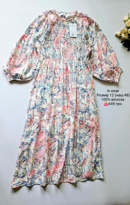 Плаття міді від In Wear. Розмір 12 (наш 48). Склад: 100% віскоза. Заміри: довжина по спинці 123 см, ПОГ 49 см, ПОТ 40 см резинка тягнеться до 45 см, ПОБ 66 см, плече 6 см, довжина рукава 54 см. Стан новий з бірками.