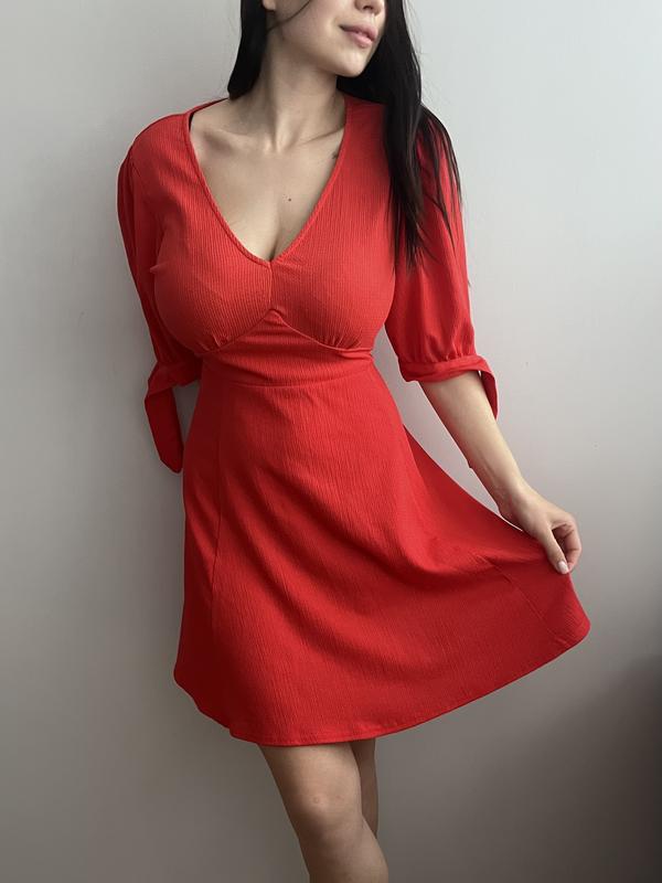 Ідеальна ніжна сукня на запах Гарно підкреслює талію Обʼємні рукава з завʼязками На літо приємна тканина Дефектів немає Розмір М