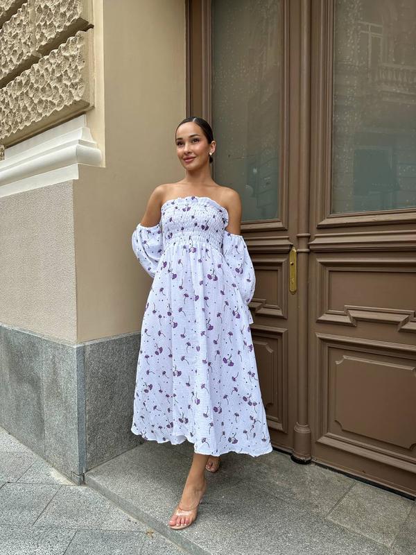 Женское муслиновое платье миди в цветочный принт, летнее платье с обнаженными плечами