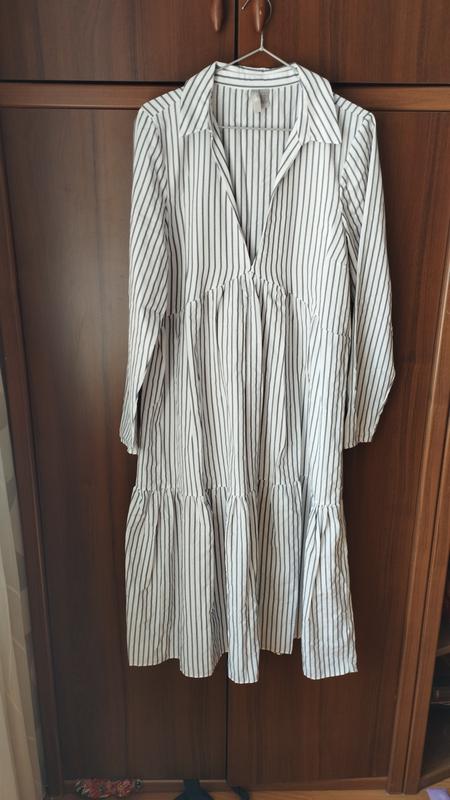 Сукня у смужку. А сілует. Довжина - 117 см, ширина під пахвами - 52 см, рукав - 61 см. Глибокий виріз гарно витягує сілует, акцентує груди. Сукня без бірки, не носилась. Замовляла з Америки сама, вона одразу була замала. Тканина досить щильна, тримає форму, але за рахунок вільного силуету відчувається дуже повітрянно. 50% котон