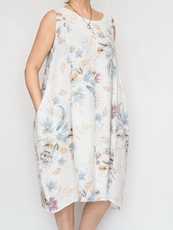 Любите стильные комфортные вещи? Вам сюда. Предлагаю легкое льняное платье в бохо стиле, New Collection, Италия. Крой свободный, силуэт "бочонок", в боковых швах карманы. Выполнено из натуральной дышащей, очень приятной к телу ткани в нежный цветочный принт. Очень комфортное, не жаркое, нежное, женственное. Идеально для жаркой погоды. Состав: 100% лен. Размер указан U Замеры тут: по груди 58 см по талии 73 см по бедрам 95 см (полуобхват) длина 109 см пройма 26 см Вещь в безупречном состоянии. Обмена и возврата нет. Ф270324