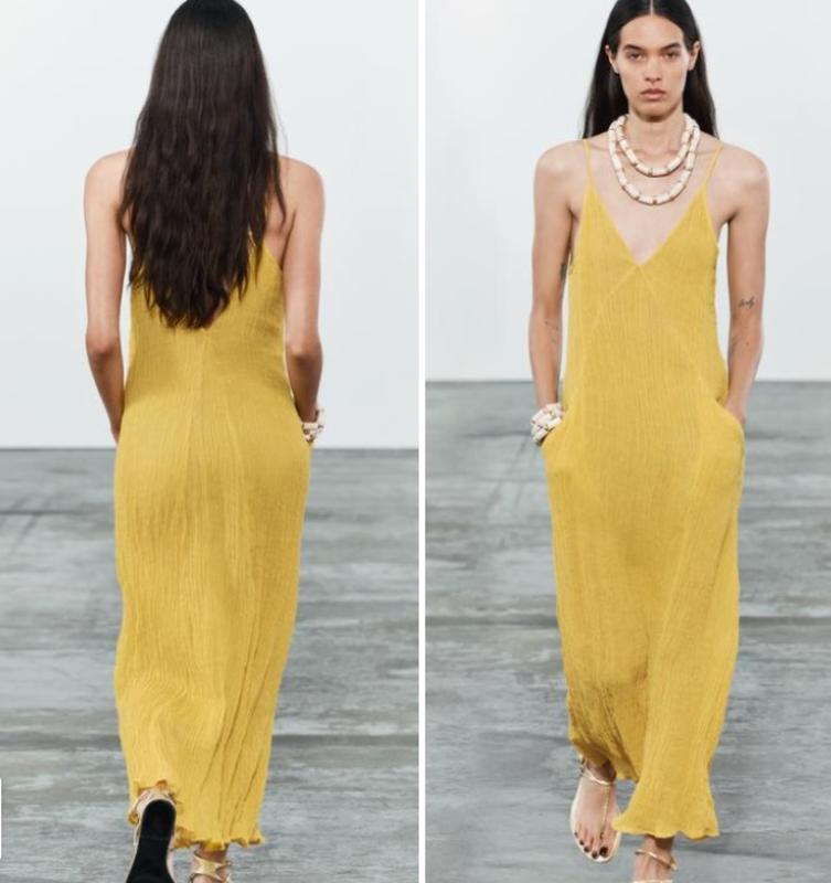 Сукня. лляна жовто гірчичного кольору середньоі довжини на бретелях. V- образний виріз, бічні кишені. ПОГ- 46, ПОТ- 46, ПОБ- 58, довжина 136. По бірці xs підійде на s.