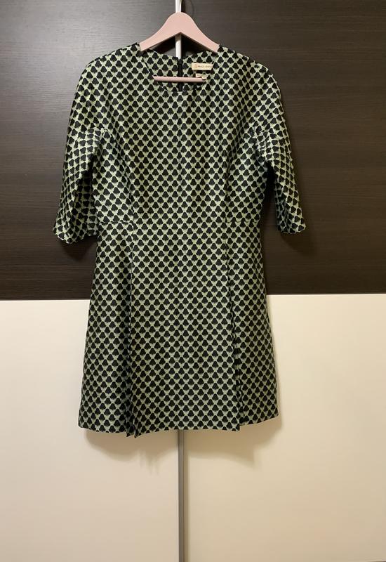 Неймовірна сукня. В новому стані. Слідів носіння немає. Вироблена з якісного шовку та котону, підклад- ацетат. На дотик дуже приємна. Забарвлення в зелено- бежеві метелики. Складний і водночас дуже красивий крій, на спідниці по дві складці з кожної сторони, трапеція. Шов від рукава по лінії грудей в складку. Дуже красиво. Додаткові фото зроблю. Позаду довга блискавка, складок немає. Розмір вказано- 40. Рукав від горловини-49, під пахвами-46, пот-39, довжина-87. Питайте.