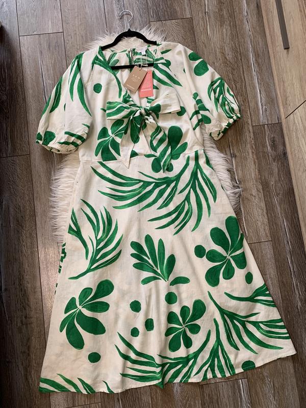 Роскошное платье миди Monsoon с бирочкой. Размер указан L. Склад: 92% хлопок, 8% льон. Длина 117см Рукав от горловины 44см Пог 56см Пот (резинка ззаду) 44,5см Длина до талии 40,5см Ширина по низу (свободная) 96см Освежающие зеленые листья ниспадает на данное платье меди, создавая разговорный принт для летних вечеров. Женский силуэт сочетает в себе рукава-буфы с V-образным вырезом на завязке. Состояние новое. Цена на сайте Monsoon - 3800 0632821 пять семь три