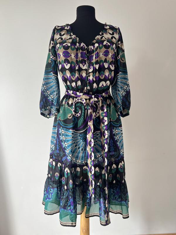 Сукня з 100% шовку бренду Esprit. Від пройми до пройми-51 см Пот-34-50 см. Талія на резинці, тягнеться. Пос-53 см Довжина-97 см Довжина рукава-43 см Літо. Шовк. Без дефектів.
