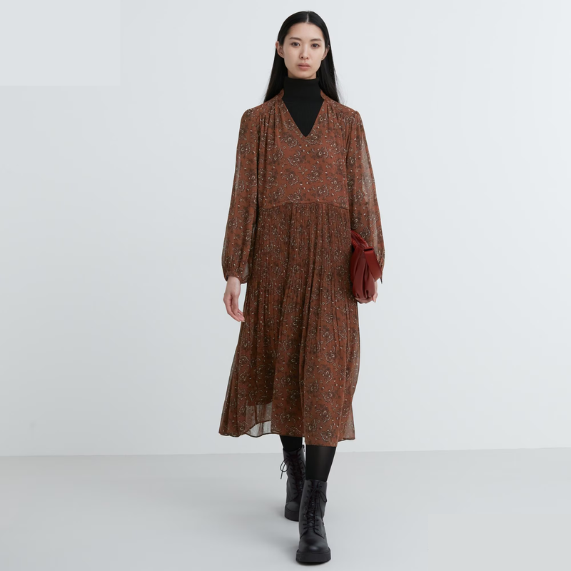 UNIQLO : C Елегантна шифонова сукня розмір ХС, М та Л, колір коричневий 36 BROWN Колекція Клер Вейт Келлер, яка привносить легку вишуканість у високоякісні щоденні речі LifeWear. Непідвладні часу предмети переосмислюються як із великими, так і з плавними силуетами з сучасних тканин для піднесеного повсякденного життя. - Прозора тканина. - Комір-стійка, V-подібний виріз. - Об'ємні рукави. - Ми видалили складки на спідниці, щоб створити більш приємний крій у формі русалки. - Регульований шнурок на талії. - Шнурки прикріплені з боків для гладкого вигляду спереду. - Підкладка з непрозорою внутрішньою накладкою для стриманого стилю. - Додані зборки на плечах і кокетці на спині. - Основний суцільний колір. Матеріал: 100% поліестер 461805