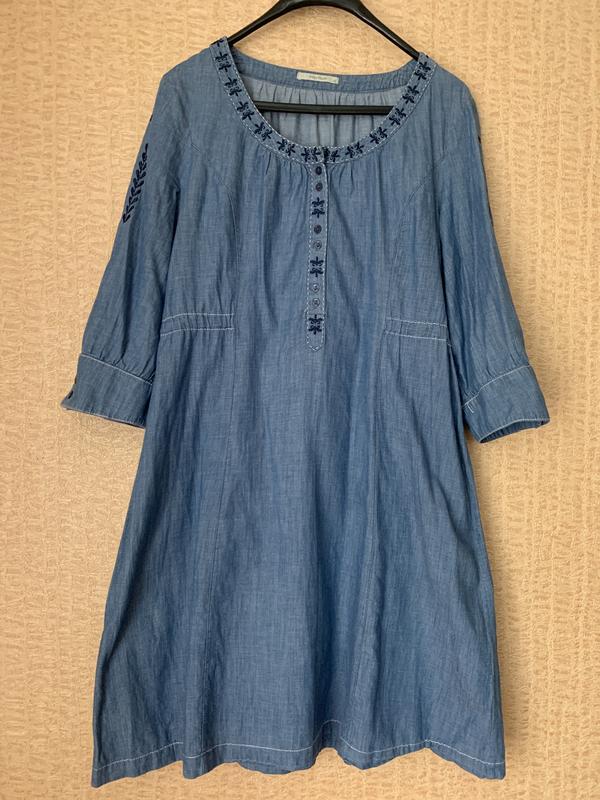 Літнє платтячко, тканина 100% котон, легенька, не парить, на спинці можна стягнути куліскою, оздоблена красивою вишивкою, рукав 3/4 Заміри: Пог 56, може бути трохи більше за рахунок виточок Пот 49, можна стягнути чи попустити Бедра 63 вільно Довжина 98 Довжина рукава від шиї 55