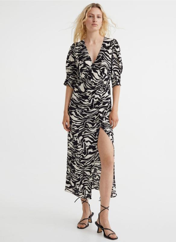 Стильное новое платье от бренда H&М, размер в наличии С. Платье-миди с короткими рукавами-буфами из вискозного крепа. V-образный вырез горловины, шов под грудью и рукава со собранными манжетами. Сборка по переднему шву создает эффект драпировки. Потайная молния сбоку. Глубокий разрез спереди внизу. Без подкладки. На размер S: Длина по спинке – 112 см